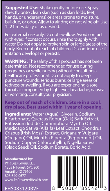 Water, Glycerin, Sodium Bicarbonate, Oak Bark Extract, Potassium Iodide, Myrrh Resin Extract, Alfalfa Leaf Extract, Irish Moss Extract, Oregano Oil, Peppermint Oil, Sodium Copper Chlorophyllin, Black Seed Oil, Sodium Borate, Boric Acid.